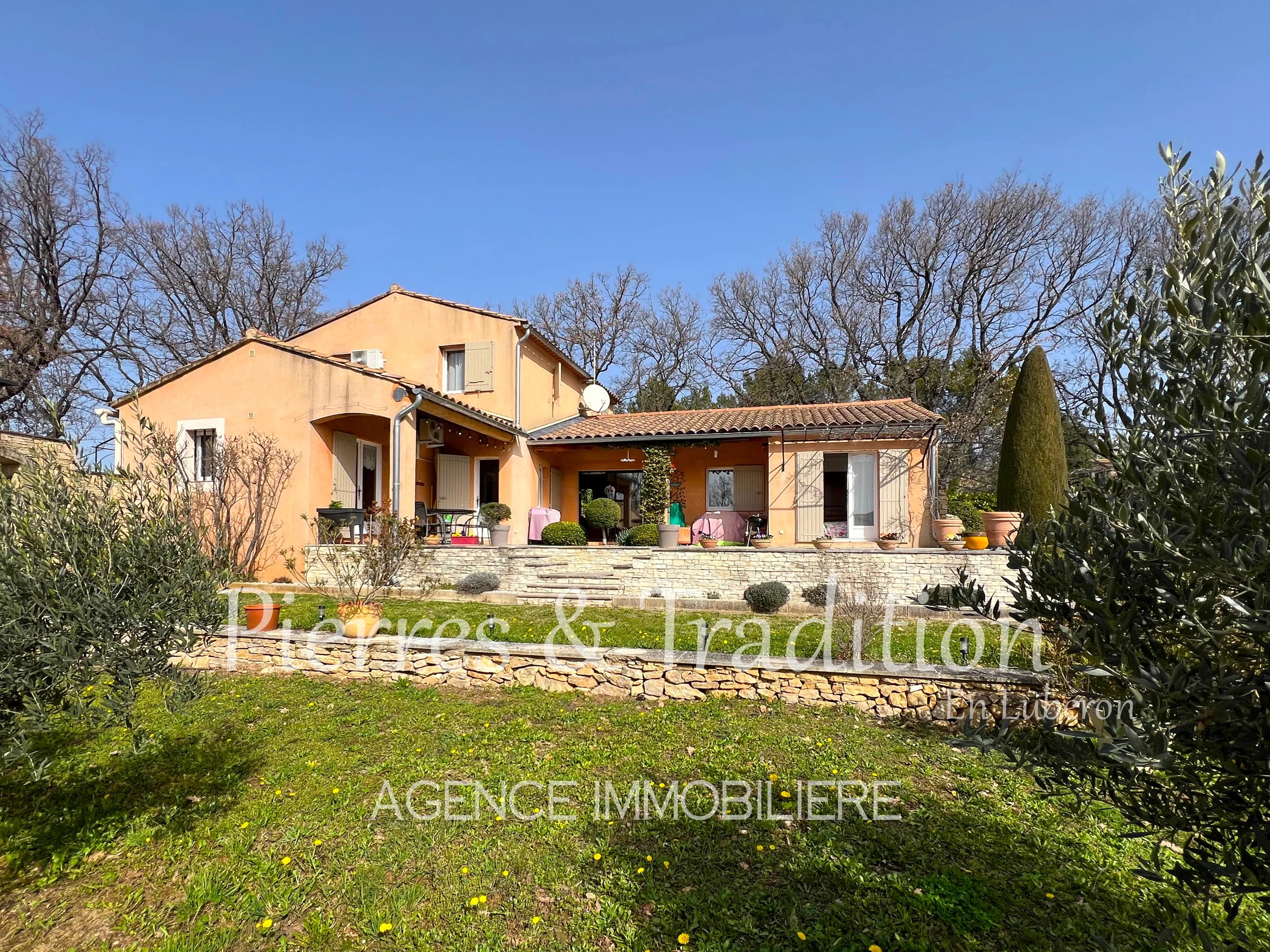 À l’extérieur, de vastes terrasses invitent à la détente autour de la piscine chauffée. Exposée plein sud, la propriété bénéficie d’une agréable vue dégagée sur le Luberon.